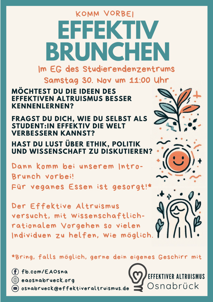 Zum Semesterstart wollen wir euch wieder herzlich zu einem Brunch einladen. Wenn ihr mehr über Effektiven Altruismus ganz allgemein und unsere Gruppe in Osnabrück erfahren wollt, dann kommt am Samstag, den 28.10. um 10 Uhr in den AStA (Alte Münze 12).